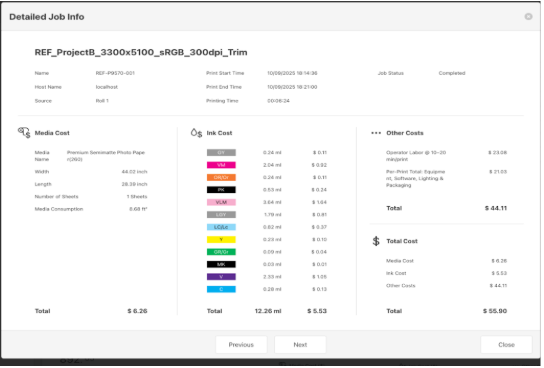 But since The Refinery operates just one printer, they found Cloud Solution Port’s Cost Accounting feature most valuable. Cloud Solution Port lets users enter the cost per roll of media and ink cartridges to calculate supply cost per print. The Refinery added extra factors – like operator salary, operator time for each print, printer and RIP upfront cost and maintenance annualized over a year, packaging, etc. – to determine a true cost per print. These costs can then be assigned to specific clients for accurate billing.