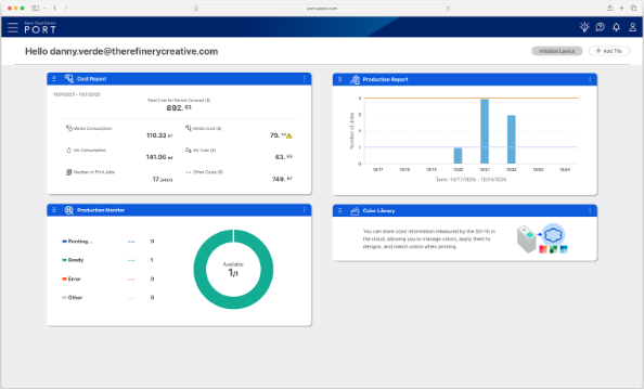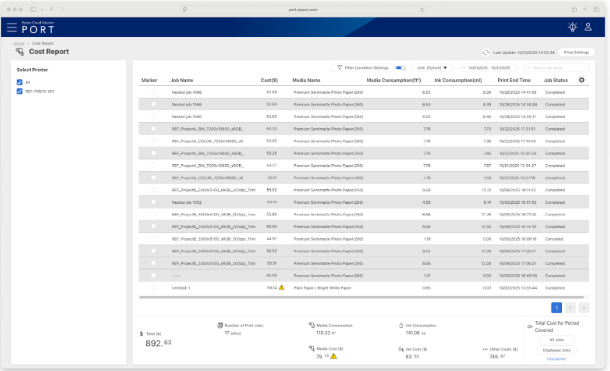 One benefit of the P9570 that has proven to be an unexpected and a critical advantage is the Epson Cloud Solution Port Software. Cloud Solution Port is browser-based printer monitoring and cost accounting software. The Cloud Solution Port’s Dashboard is particularly useful if you manage a fleet of printers and want to monitor which printers are being most heavily used (for load balancing) or which are up and ready for production vs those that have an error.