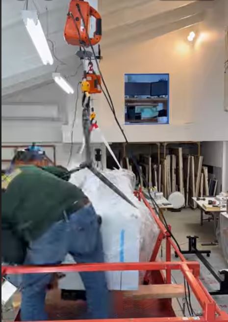 How do you get a 500 pound, 108” wide printer into a second floor office with a narrow stairway? By cutting a hole in the wall and using a scissor lift, of course!